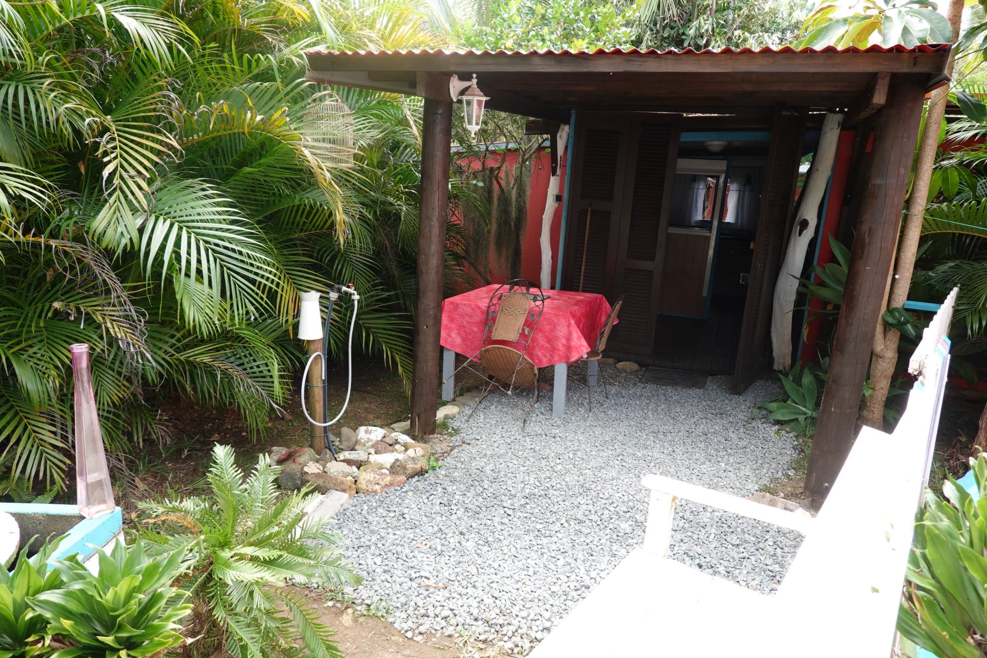 Chalets « Les Amériques » : chambre double – dressing – cuisine séparée avec salon et espace repas – WC/Douche intérieur du chalet - terrasse couverte et jardinet tropical privatif. Etendoir privatif